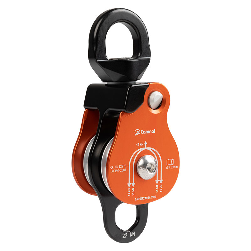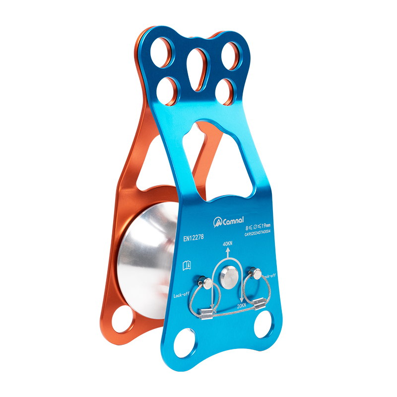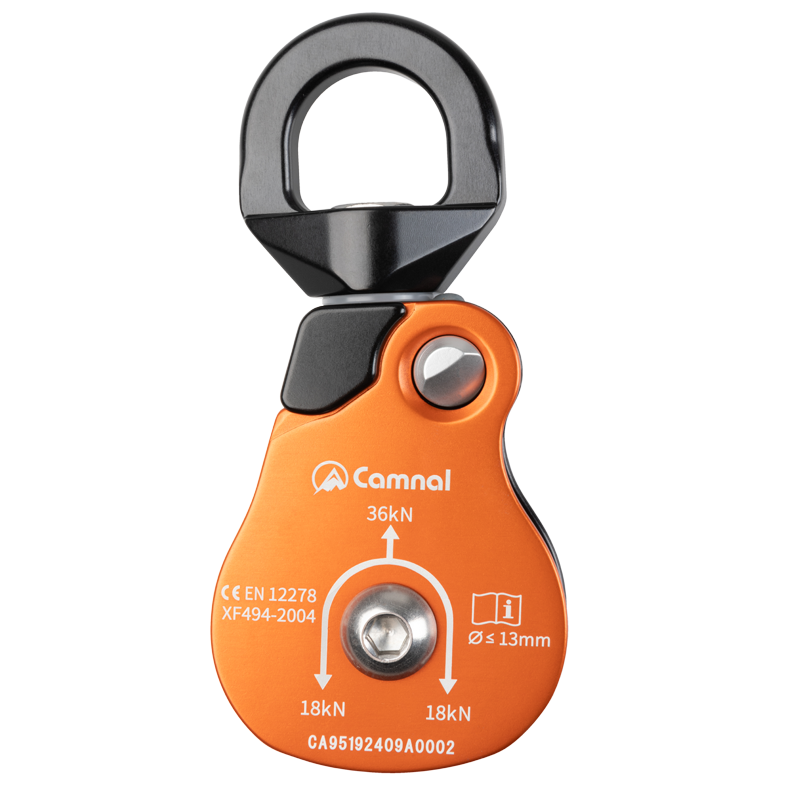 高效率万向单滑轮·滑轮设计用于最大限度简化提拉系统、溜索的设置或改变负重方向操作·单⾯可开侧板,固定在锚点上也可打开,方便绳索装入·侧板两段开锁设计,防⽌误操作·大直径密封滚珠轴承,拥有超高的滑轮效率