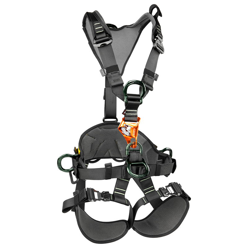 易于使用的可调节安全带,带有一个装备环:·可快速穿戴款式,腿部铝合金快拆扣穿戴更加快捷方便·单一的连接点,便于使用和快速目视检查,绿色编码的连接点,配有标签标识,一个灵活的装备环,用于携带装备让向导或